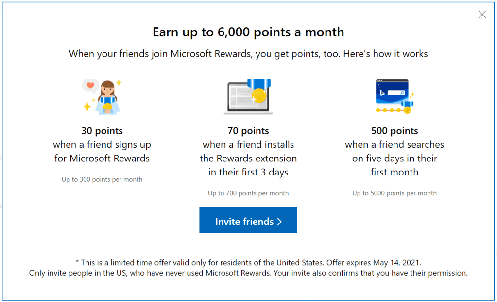 So I created a post a while back talking about how to earn money with Bing search engine, make sure you check it out if you haven’t yet. At that time, there was not a referral reward for their search rewards program but that just changed! For the next year, you have a chance to get up to $6 a month in rewards points as long as you get get 10 sign ups a month, get them to install the extension after sign up, and get them to use their search engine at least 5 days in a month. Probably won’t be the easiest task but even if you can’t get others to sign up and do it you can always get all of the tasks done yourself and earn $10 a month just from searching everyday.