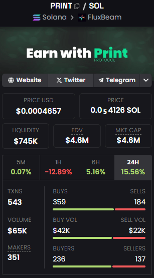You can buy $print through Bitmart.com or go to www.PrintSolana.com for information on how to buy it through Fluxbeam or Jup.ag. I believe we’ve hit the bottom so it’s a good time to get in. I thought a 10x from 0.001 was easy but now you can see we can get back to where we were for huge gains! If you’re wondering what is next for Print Protocol then I suggestion you follow them on X/Twitter or join the Telegram.