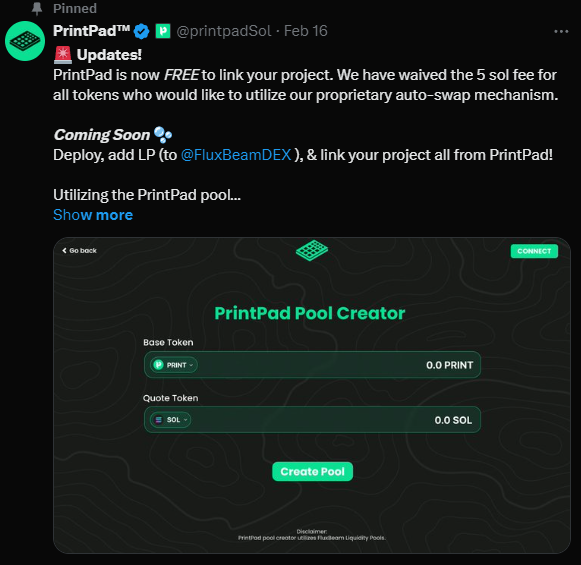But if you think that was all you’re in for a treat. The Print Protocol team is still coming up with more utility! They have launched PrintPad which allows you to easily create your own token with taxes that can pay you back as people buy/sell your token! It used to be costly to create a token and create liquidity but soon PrintPad will be waiving the 5 sol fee and make it easy!